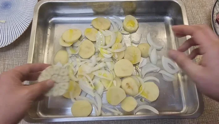 - Repartir las patatas y la cebolla en la fuente. Salpimentar ligeramente y agregar un chorrito de aceite.