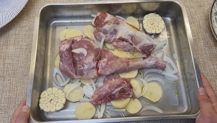 - Colocar la paletilla de cordero sobre la cama de patatas y cebolla, con la piel hacia abajo.