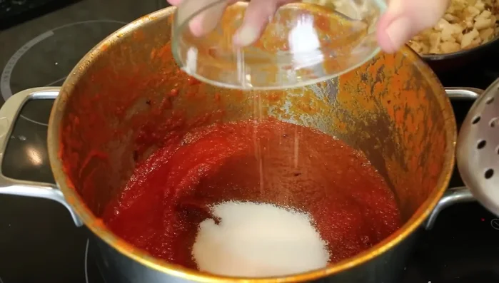 - En una olla, sofreír tomate triturado con aceite y sal. Tapar y remover ocasionalmente.