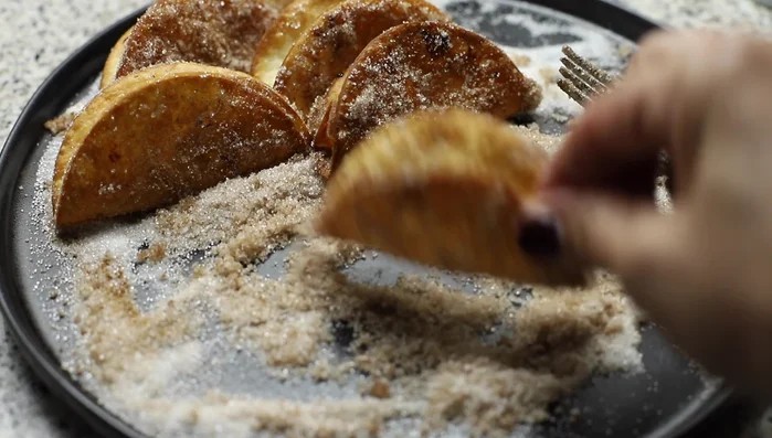 - Una vez fritas y ligeramente doradas, retirarlas del aceite, escurrir el exceso y pasarlas por una mezcla de azúcar y canela.